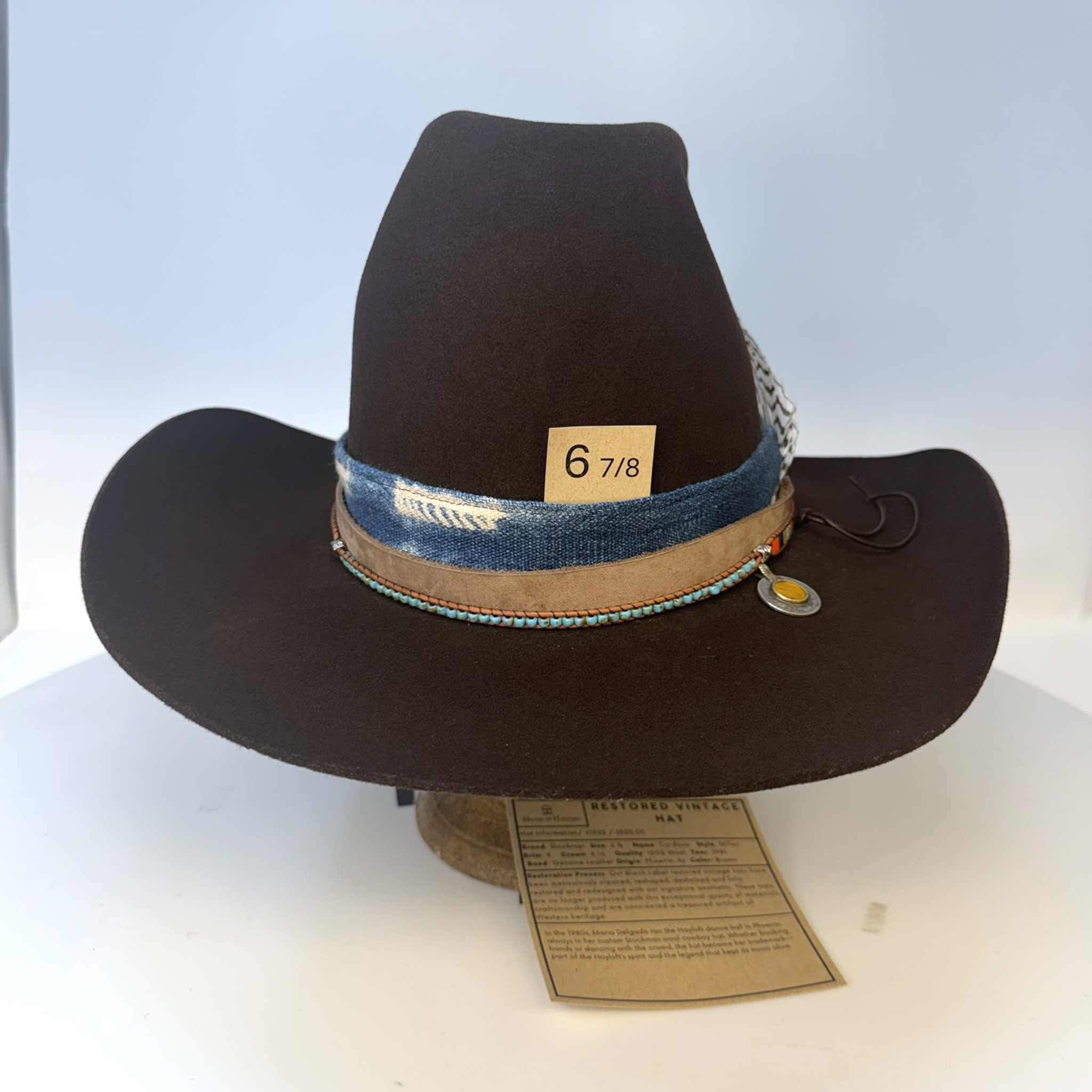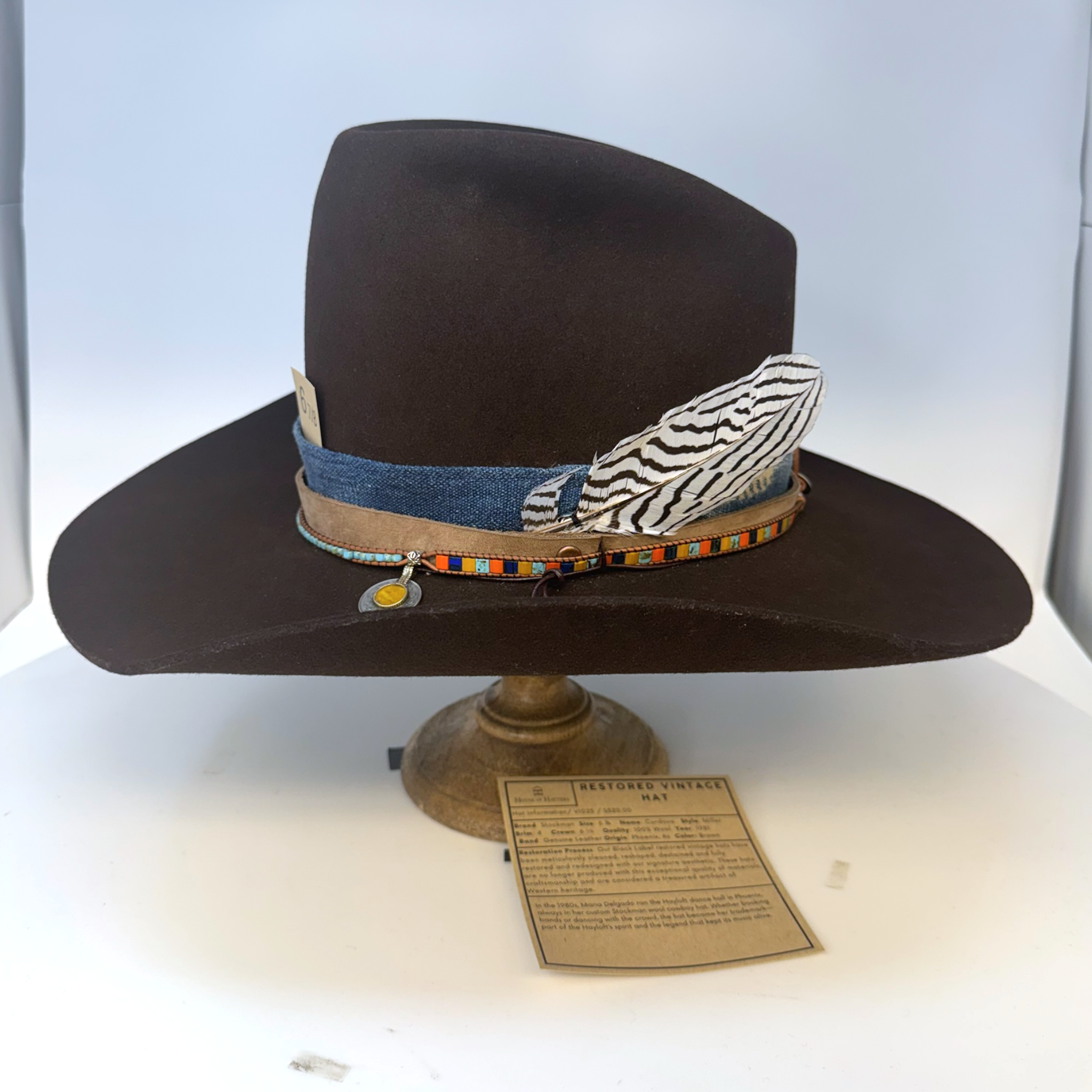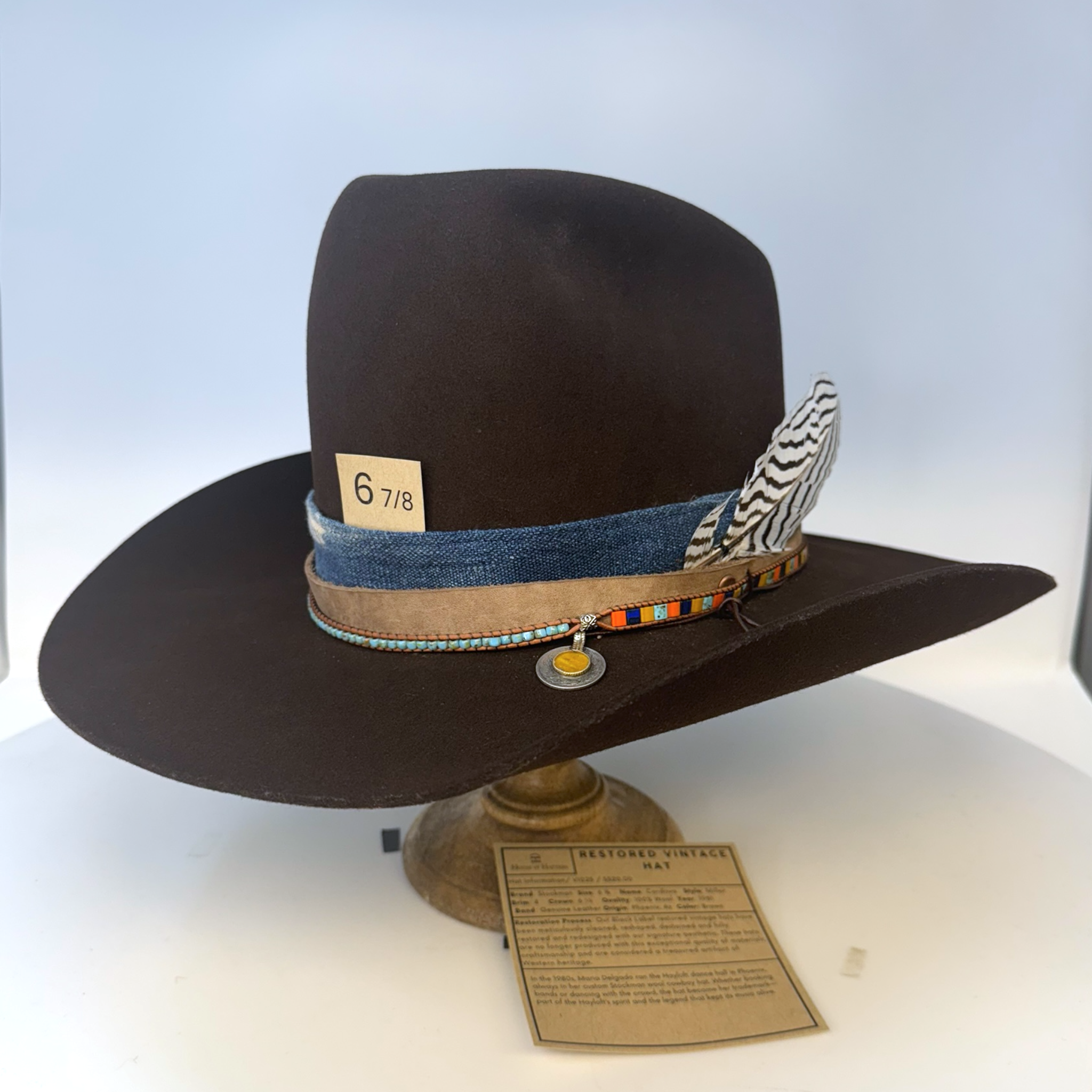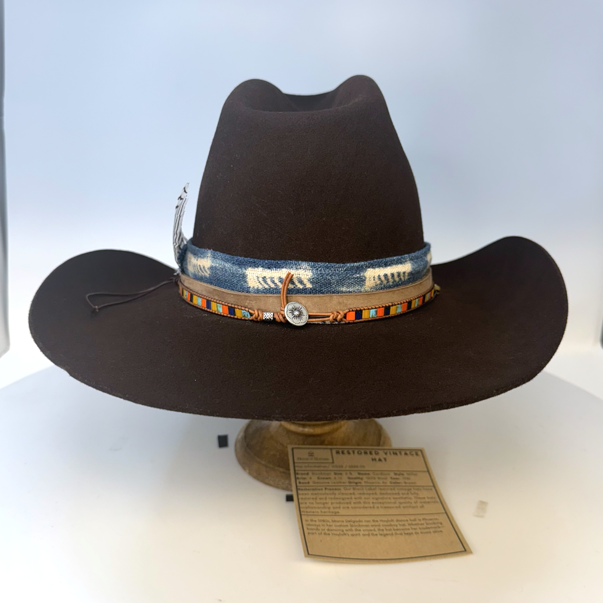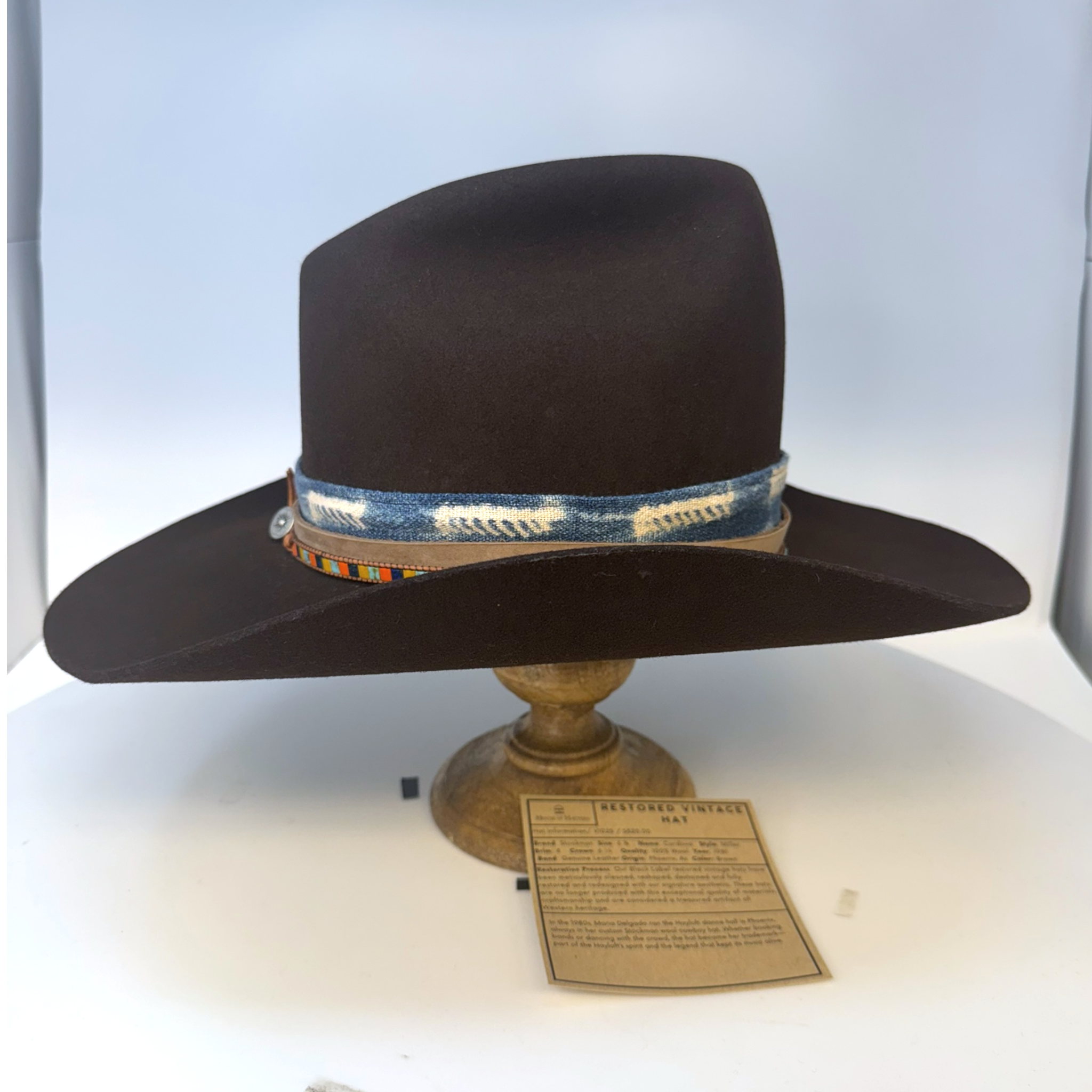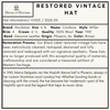 Restoration Process: Our Black Label restored vintage hats have been meticulously cleaned, reshaped, destained and fully restored and redesigned with our signature aesthetic. These hats are no longer produced with this exceptional quality of materials, craftsmanship and are considered a treasured artifact of Western heritage.