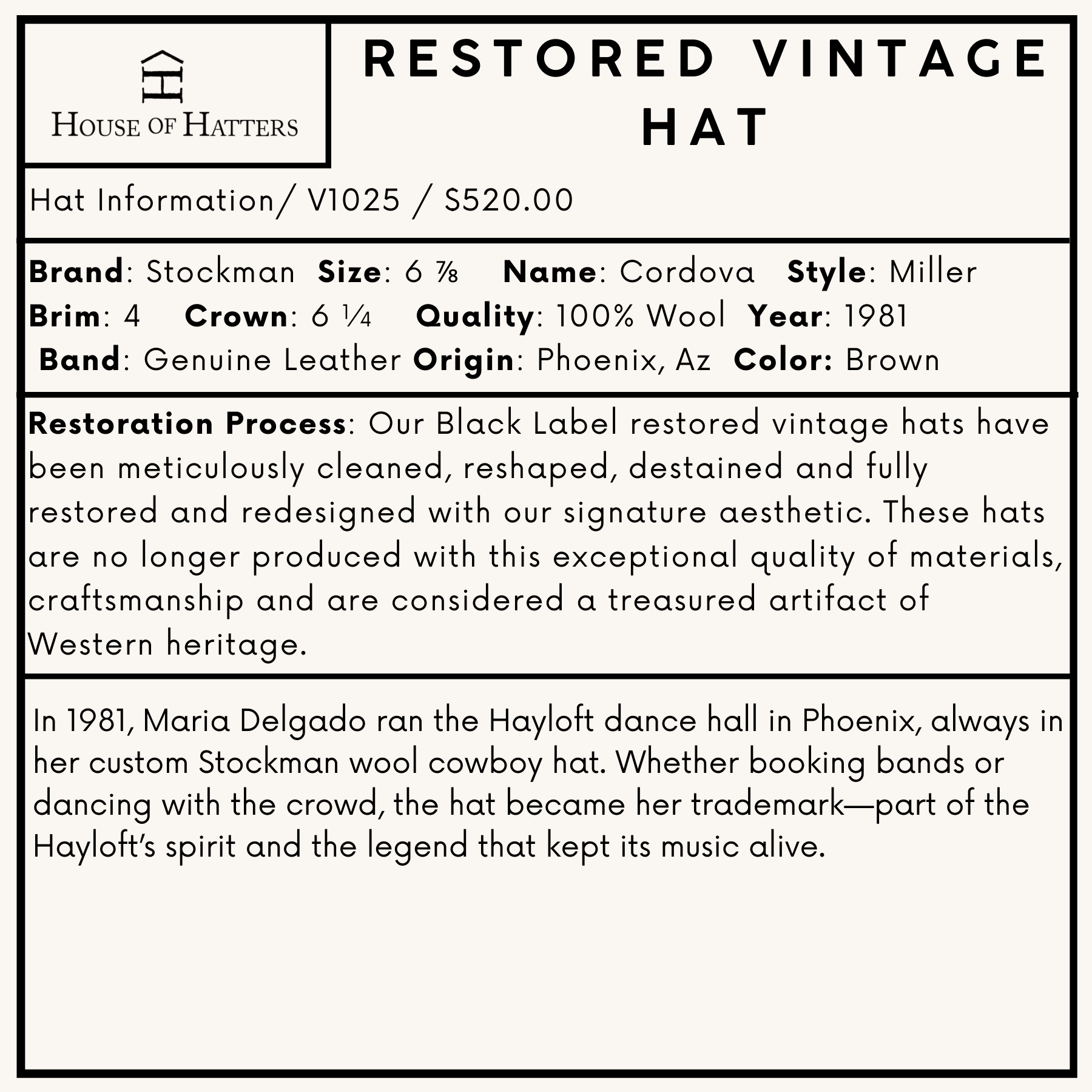Story: In 1981, Maria Delgado ran the Hayloft dance hall in Phoenix, always in her custom Stockman wool cowboy hat. Whether booking bands or dancing with the crowd, the hat became her trademark—part of the Hayloft’s spirit and the legend that kept its music alive.